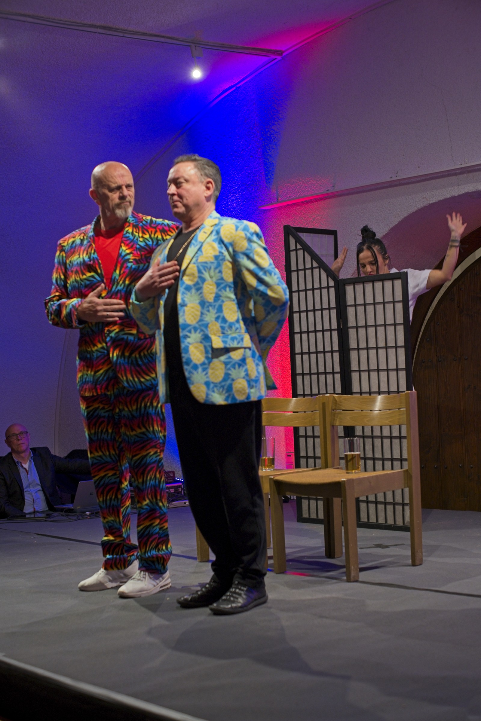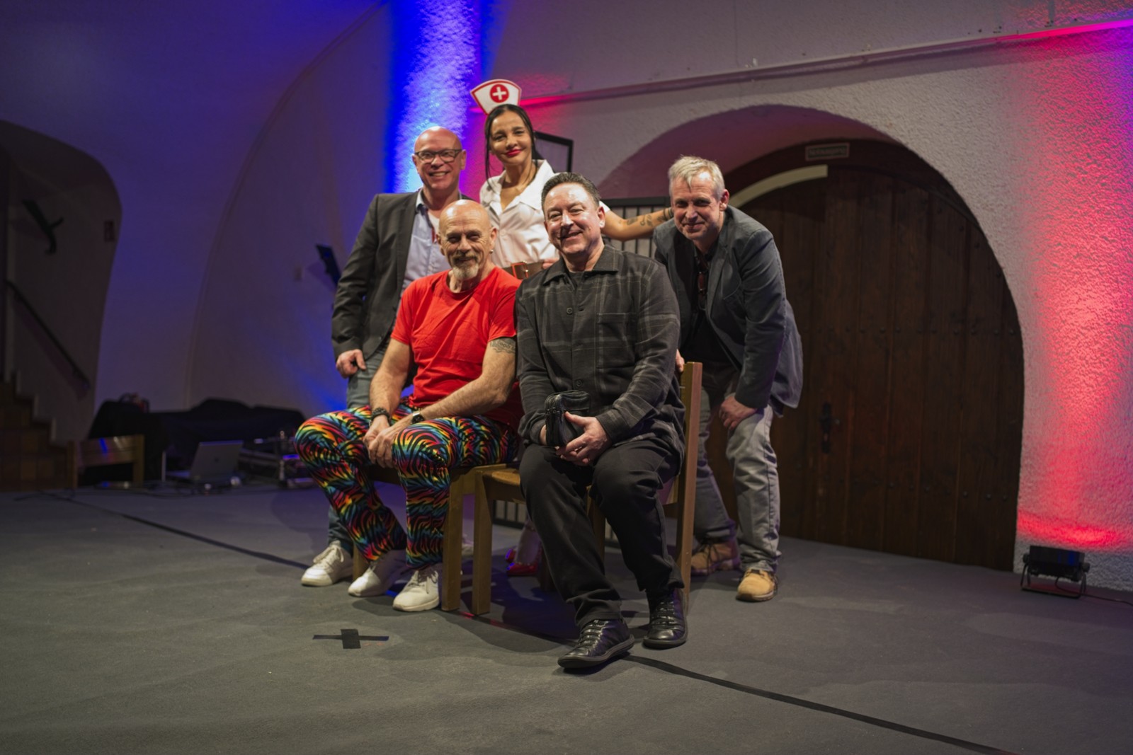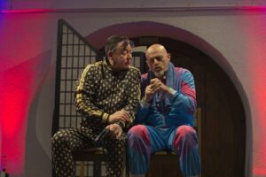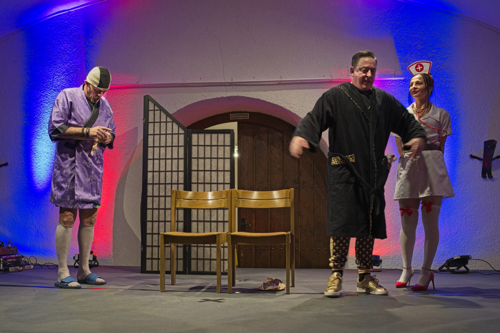 Die beiden „Schwerkranken“ wirkten überzeugend wenn sie sich in breitestem Pfälzisch über ihre Wehwehchen austauschten. Verpackt in Pointen und Witzen, hatten sie die Lacher auf ihrer Seite. Man konnte so richtig mitleiden, den Reha-Alltag nachfühlen, wenn die beiden Kranken sich mit ihrer Rieslingschorle stärkten und der Privatpatient sich nebenbei, von seiner hübschen und sexygewandeten Privattherapeutin, verwöhnen ließ. Der Streit Kasse – Privat wurde so richtig durch den “ Kaukau “ gezogen. Das Gelächter im gut gelaunten Publikum war groß und so wurde auch am Ende nicht mit Applaus gespart.
