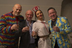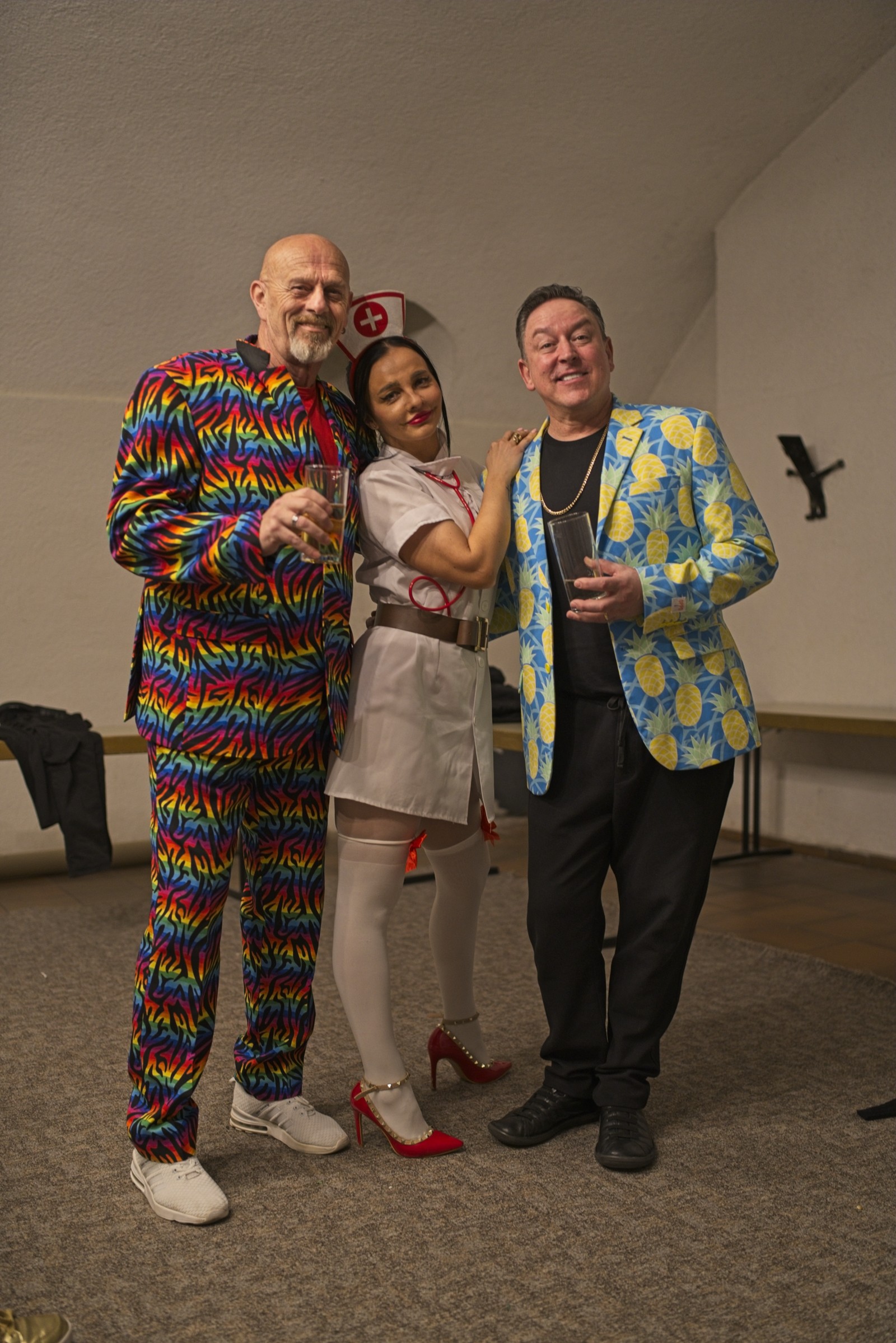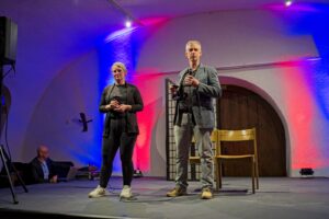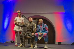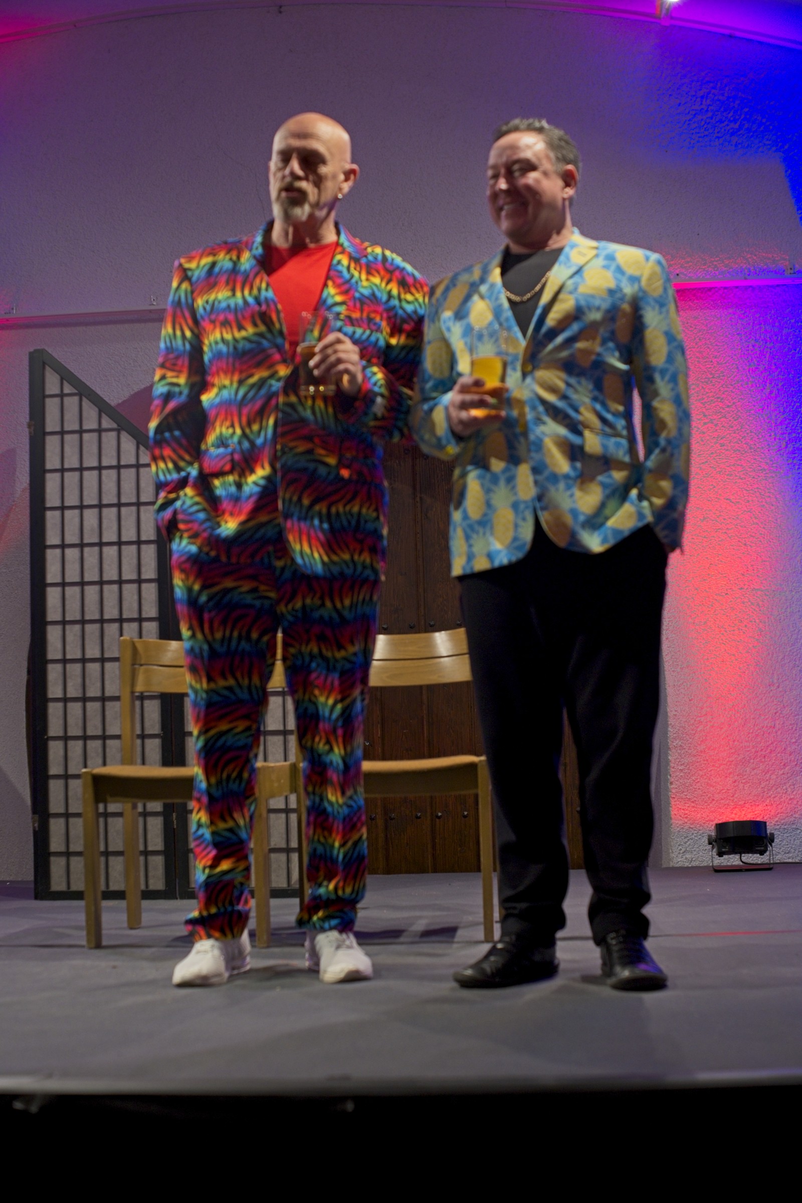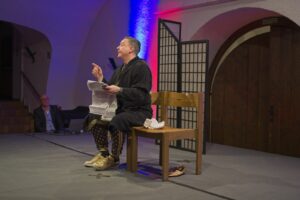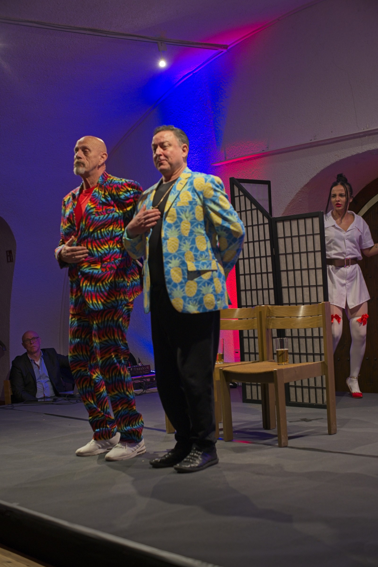 Die beiden „Schwerkranken“ wirkten überzeugend wenn sie sich in breitestem Pfälzisch über ihre Wehwehchen austauschten. Verpackt in Pointen und Witzen, hatten sie die Lacher auf ihrer Seite. Man konnte so richtig mitleiden, den Reha-Alltag nachfühlen, wenn die beiden Kranken sich mit ihrer Rieslingschorle stärkten und der Privatpatient sich nebenbei, von seiner hübschen und sexygewandeten Privattherapeutin, verwöhnen ließ. Der Streit Kasse – Privat wurde so richtig durch den “ Kaukau “ gezogen. Das Gelächter im gut gelaunten Publikum war groß und so wurde auch am Ende nicht mit Applaus gespart.