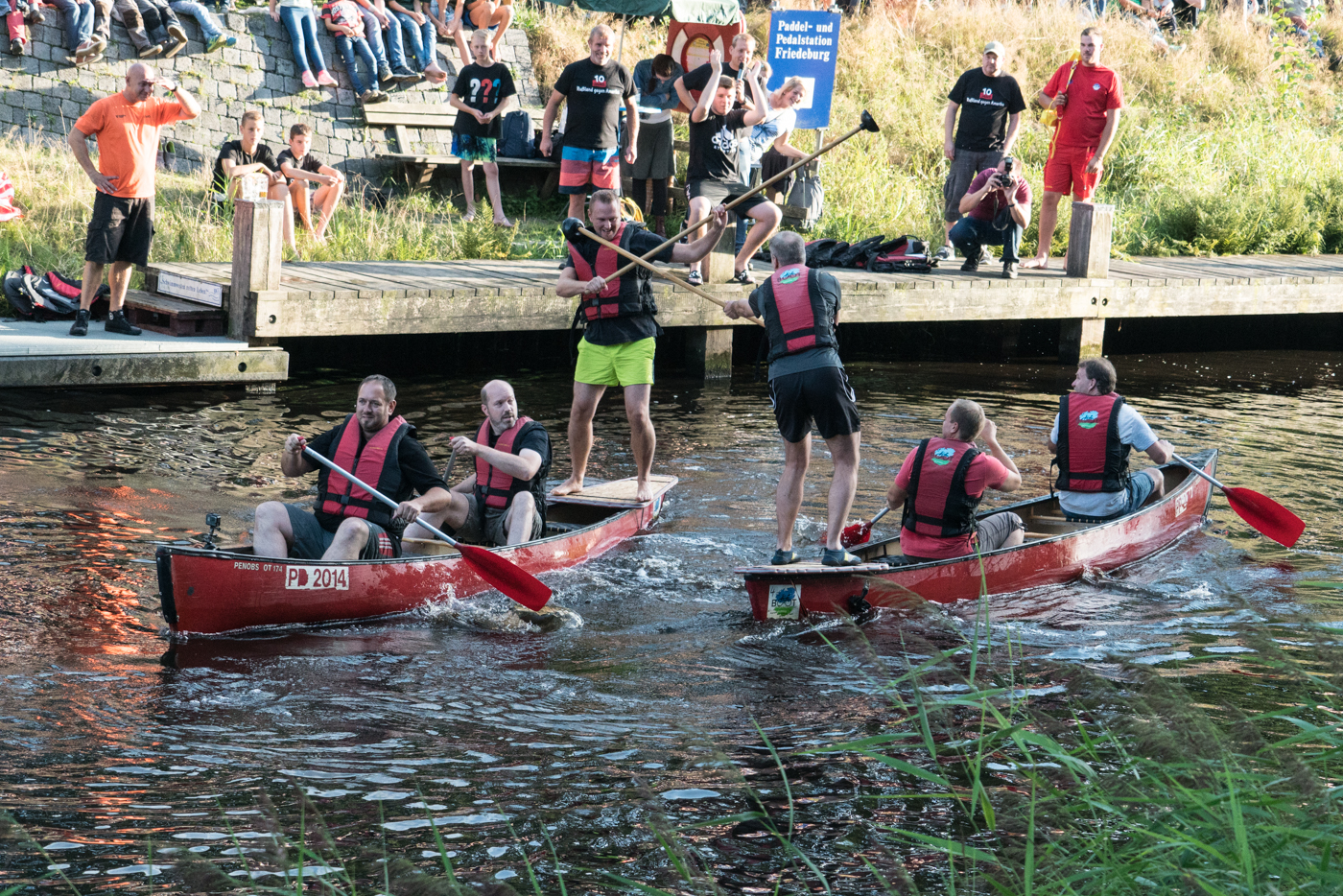 Die Mannschaft besteht aus drei Personen, zwei Paddler und ein Stecher, die in drei Durchgängen gegeneinander antreten. Wer ins Wasser fällt hat verloren. Der Gewinner kommt eine Runde weiter bis nur noch zwei Finalgegner vorhanden sind.